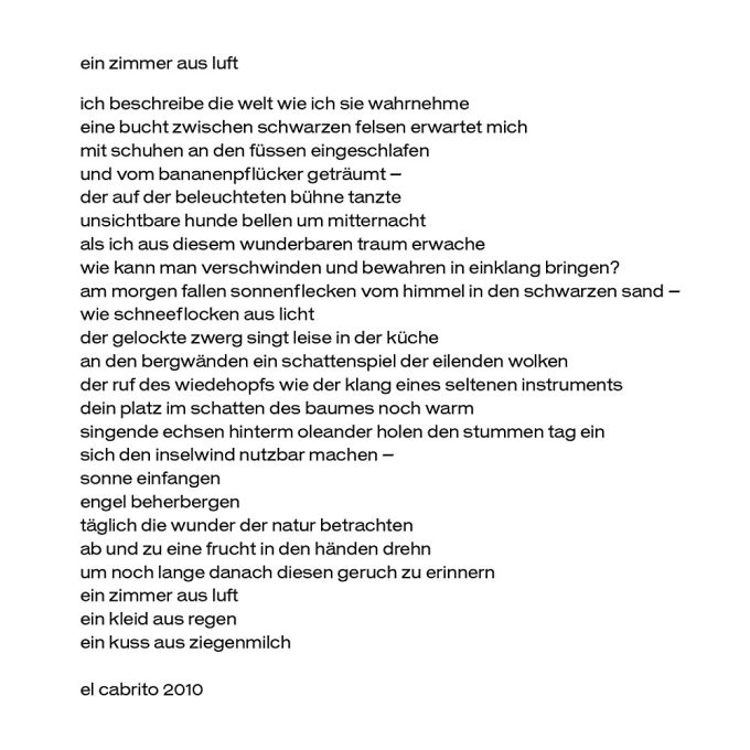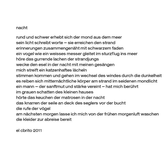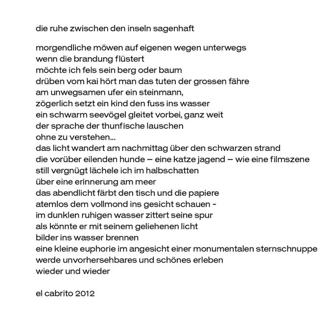 Die Sehnsucht nach der Insel ist eine weitverbreitete Sucht und spannende Sicht. Wieso müssen wir eigentlich erst dahin, um bei uns selbst kurz mal anzukommen? Die Esel der Nacht zu wecken mit den eigenen Gesängen und sich auch noch von katzenhaften sanften Lächeln streife zu lassen. Ein blaues Buch der Erinnerung an gelassene Zeiten tiefer blauer Traumwelten und Meereswellen – es könnte einfach in der Handtasche liegen.