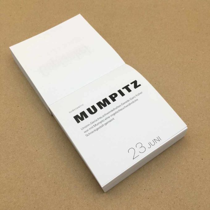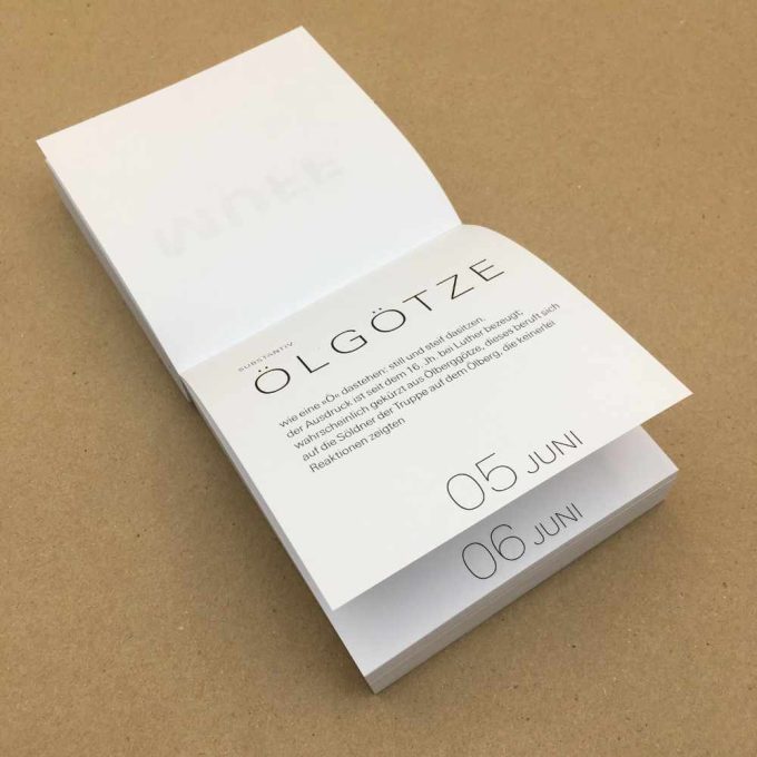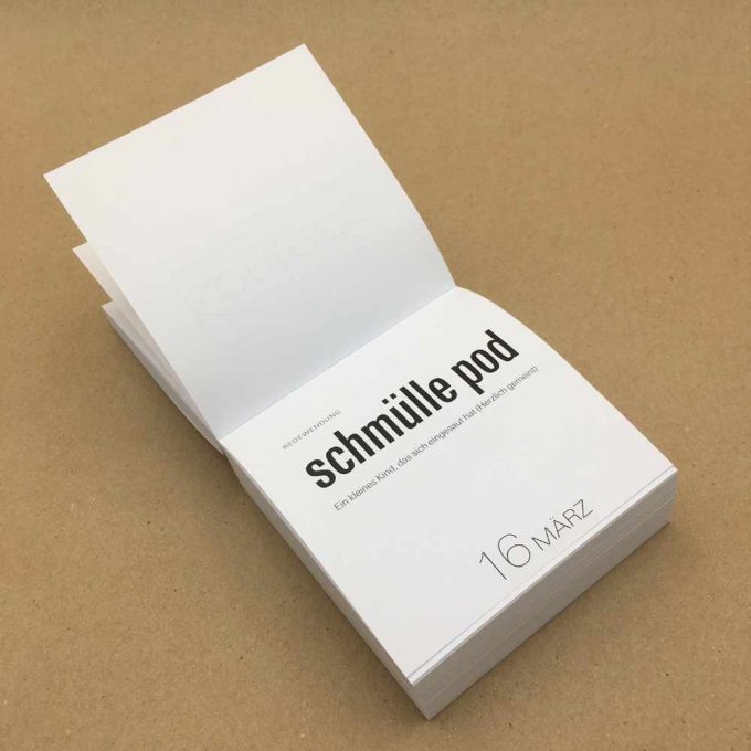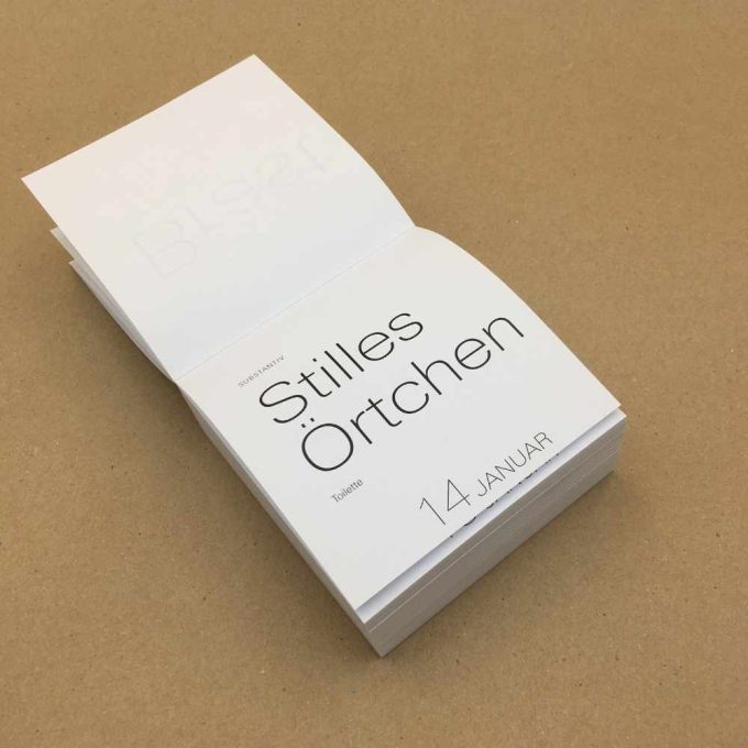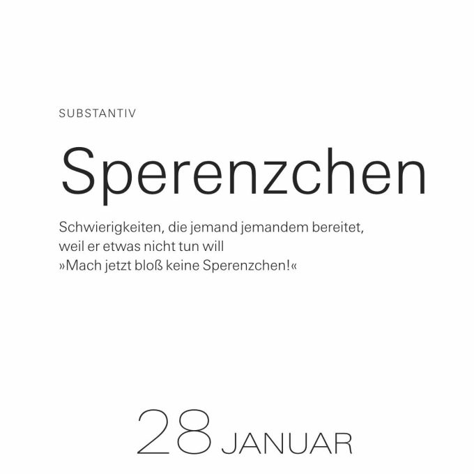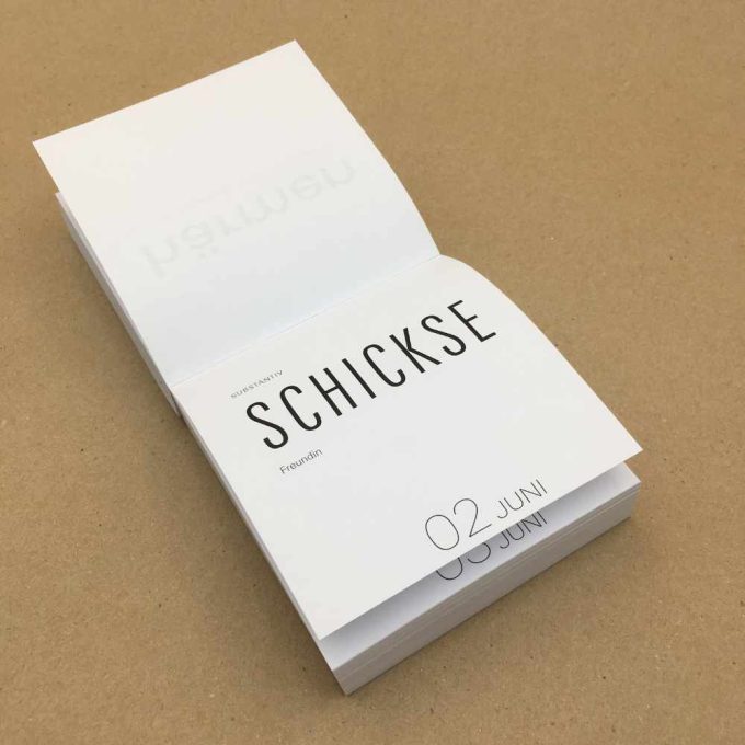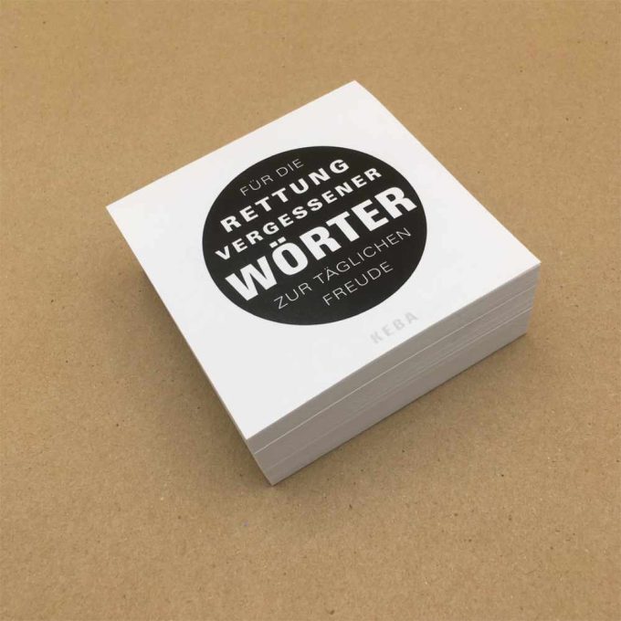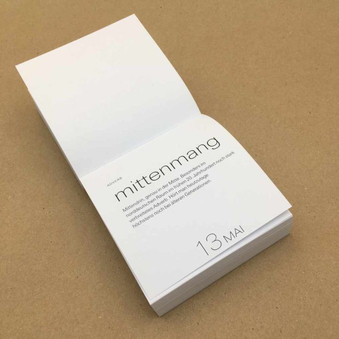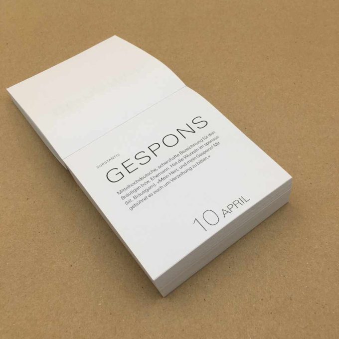 Ein Abreisskalender mit vergessenen Wörtern zur täglichen Freude. Format 10,5×10,5×4,0 cm. Da es bei diesem Kalender keine Wochentage gibt, kann man ihn als immerwährend verstehen.